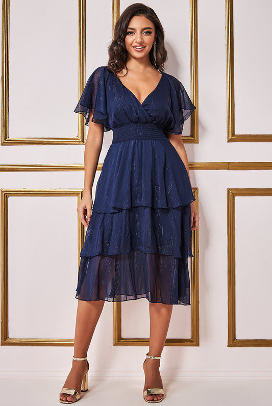 Goddiva Plain Lurex Chiffon Tiered Midi Dress