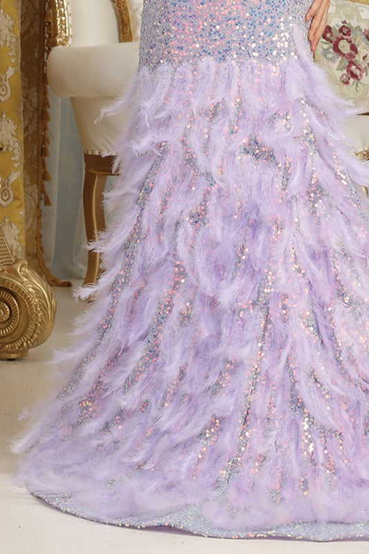 Bustier Corset Iridescent Sequins Feathered bottom Prom Dress in Lilac and Gold