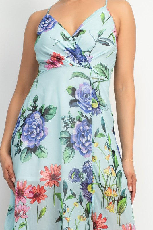 This Floral Chiffon Maxi Dress features adjustable straps and a flattering wrap top design with a surplice neckline, enhancing both comfort and style. Its A-line silhouette offers a graceful flow, while the zip-up closure ensures a secure fit. A front slit adds a touch of elegance and ease of movement, making it an ideal choice for sophisticated occasions. Crafted from lightweight chiffon, this dress combines airy comfort with refined design.