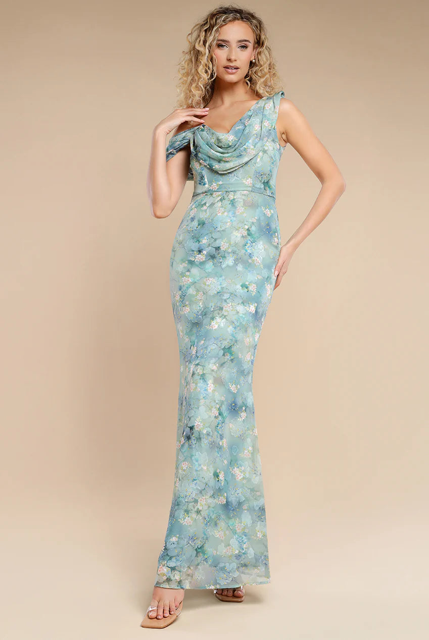 One Shoulder Cowl Neck Chiffon Floral Dress