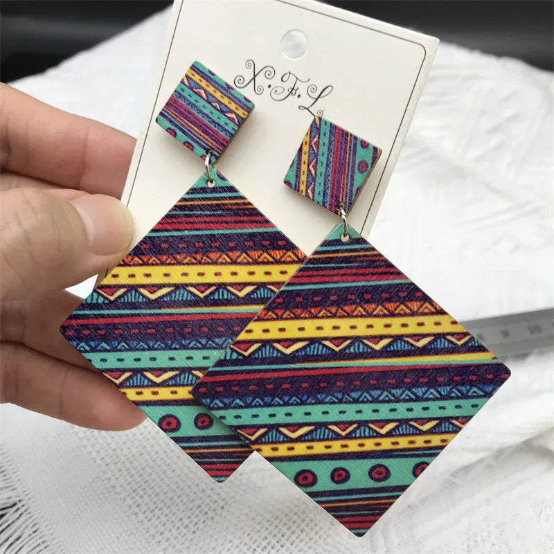 Vintage Style Bohemian Pastoral Polka Dots Rhombus Wood Drop Earrings